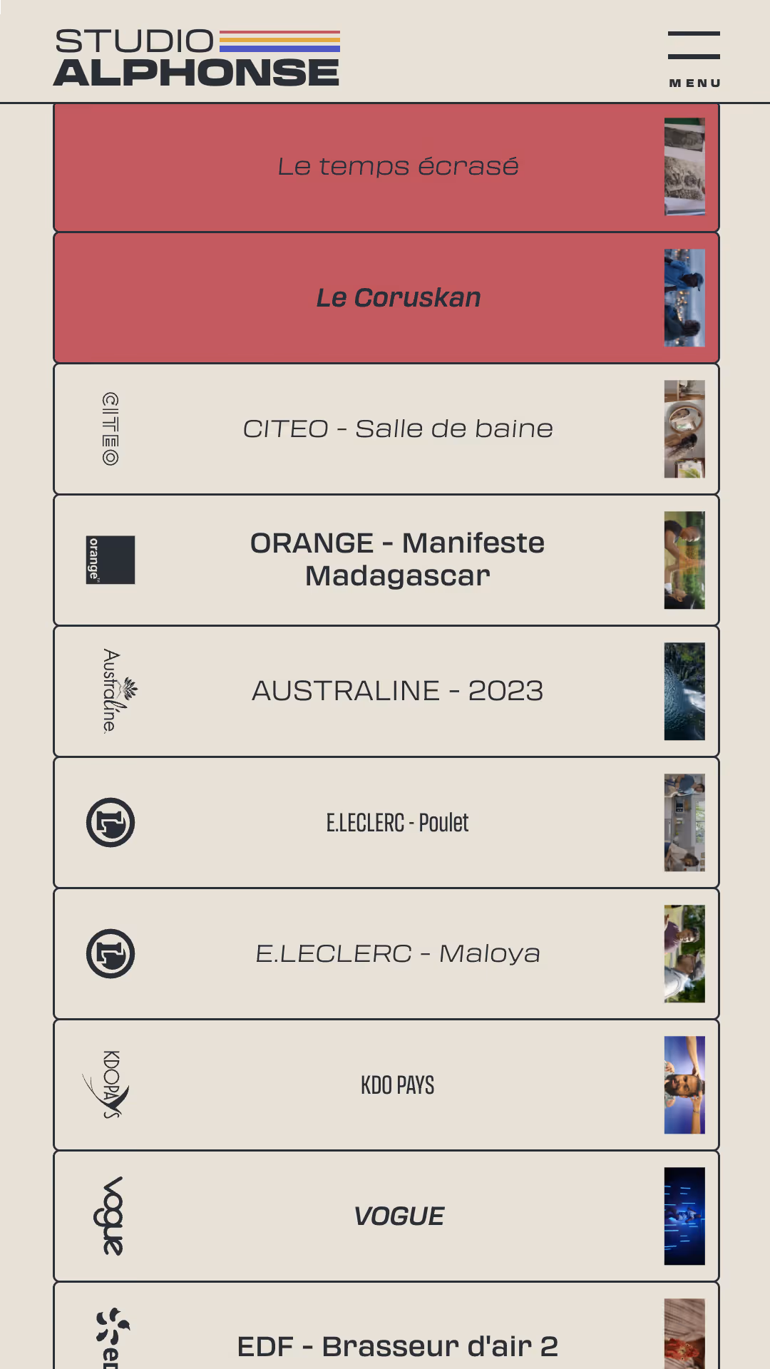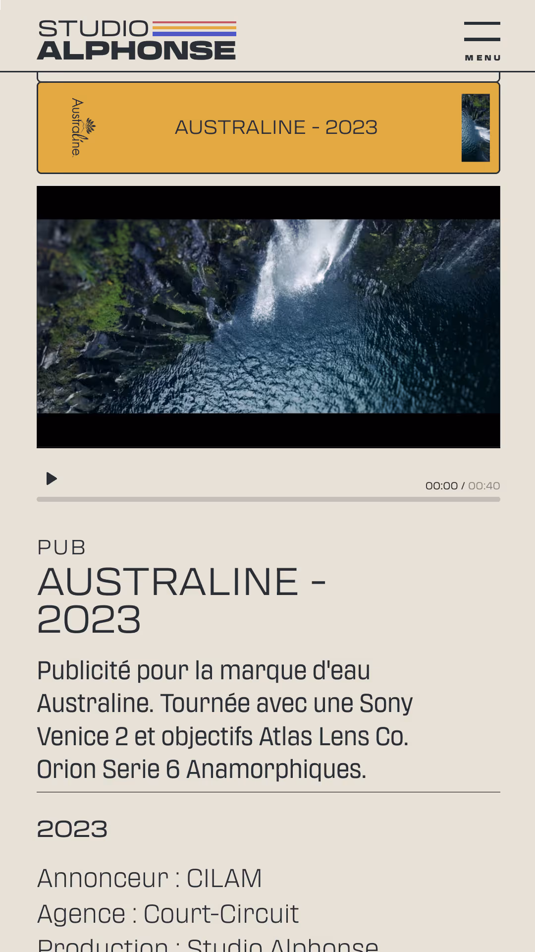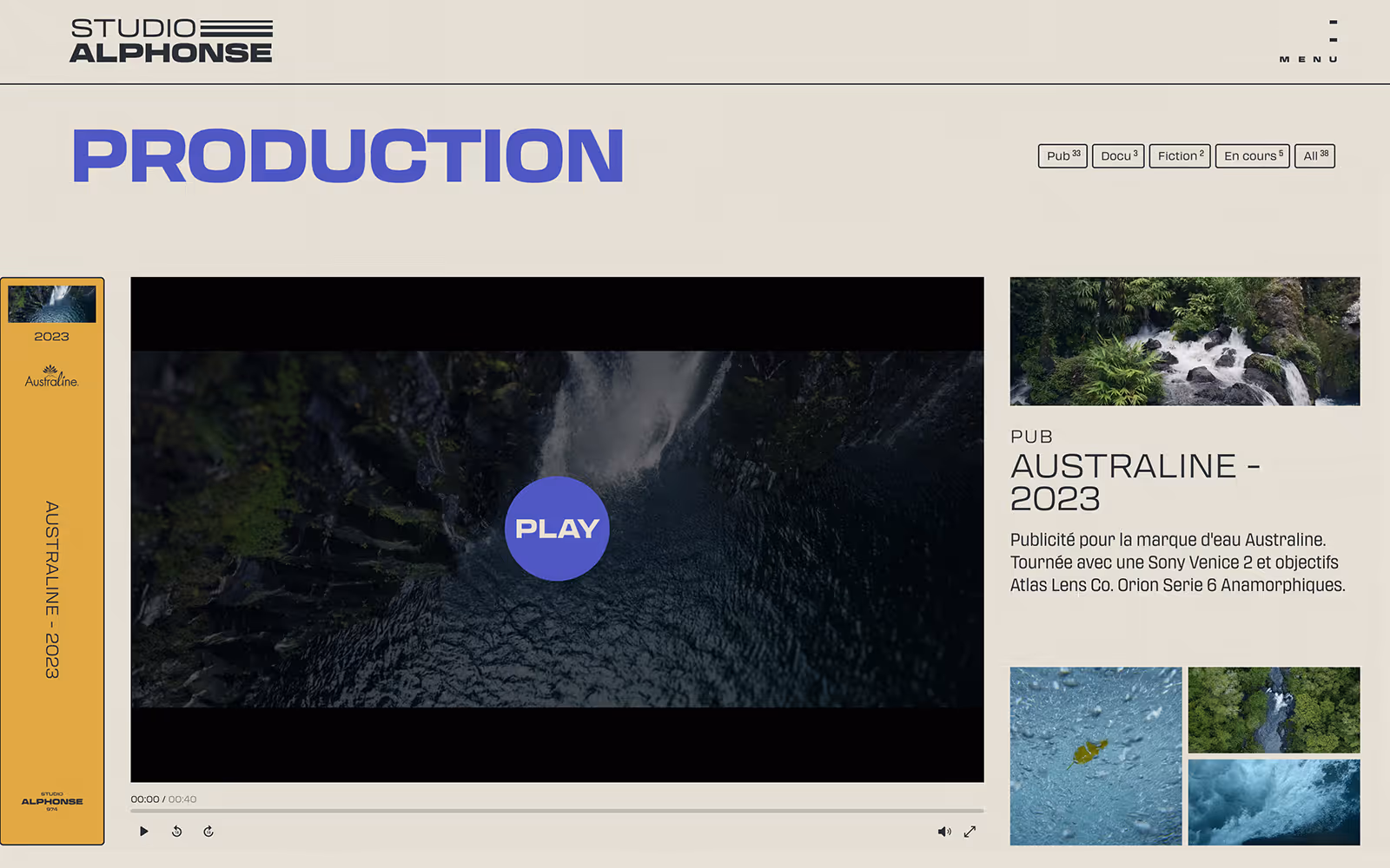 La page « Production » s’inspire des archives BETACAM/U-matic retrouvées dans les studios de post-production, ainsi que des étagères de cassettes VHS. Vignettes de production, date, logo client, titres (créés avec une variable font), collection de logos Studio Alphonse, tous ces éléments évoquent une collection de VHS. Plusieurs défis techniques ont été relevés : adapter la taille des cassettes à la fenêtre du navigateur, gérer un nombre variable de productions via le CMS, garantir un défilement fluide avec repositionnement dynamique selon la cassette sélectionnée.