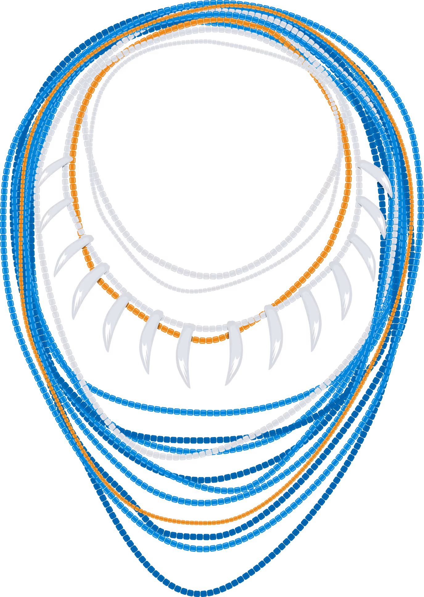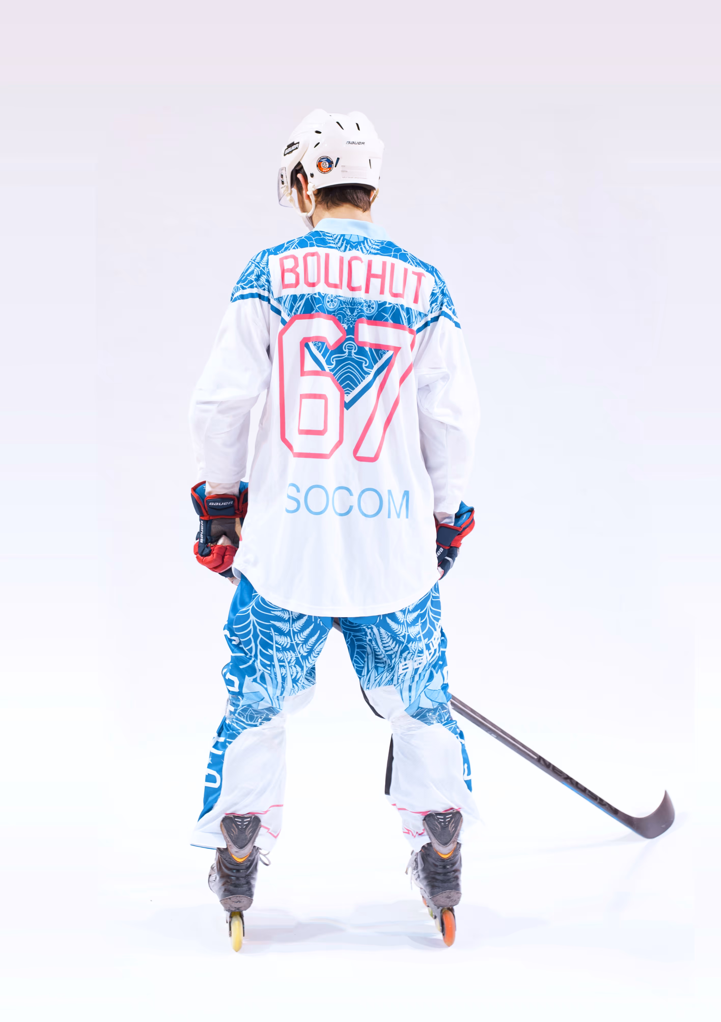 Le collier cérémonial en perles devient la pièce maîtresse de la tenue bleue. Sous forme de peinture corporelle, les motifs graphiques évoquent trophées, rituels et mémoire collective. L’ensemble forme un hommage visuel aux guerriers modernes : les joueurs sont ici perçus comme une tribu soudée, célébrant leur héritage et affirmant leur puissance à travers une tenue riche en symboles.